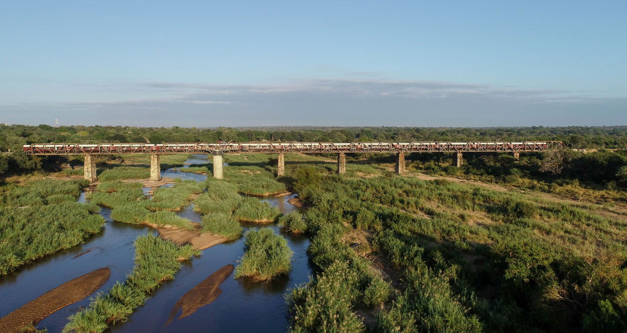 Ein Safari-Erlebnis der besonderen Art: Im Kruger Shalati wohnen Sie luxuriös in einem Zug, der inmitten einer Zugbrücke am Krüger Nationalpark steht. Die komfortabel ausgestatteten Waggons sowie die Zugterrasse bieten einen traumhaften Blick auf den Sabie Fluss der täglich Scharen an Wildtieren anlockt