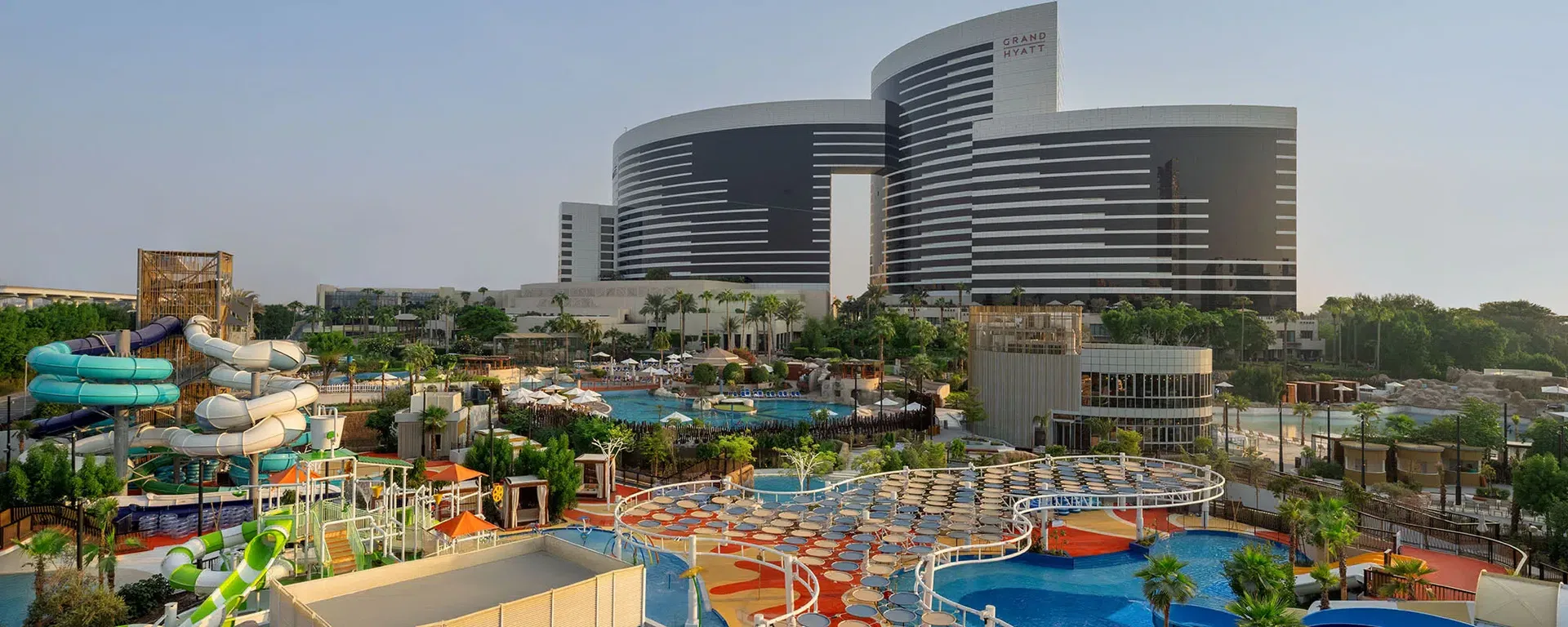 Eine Hoteloase mitten in der City: Das Grand Hyatt Dubai Resort and Waterpark beschert Ihnen einen erstklassigen Aufenthalt: Im 5-Sterne-Stadthotel erleben Sie mit dem neuen 20.000 m² großen Wasserpark und der 37 Hektar umfassenden Gartenanlage die perfekte Mischung aus Abenteuer, Erholung und Komfort. Innerhalb des weitläufigen, parkähnlichen Hotelgartens vergessen Sie schnell, dass Sie sich im Zentrum der lebendigen Metropole befinden. Vogelgezwitscher und üppige Natur säumen die abwechslungsreiche Poolanlage – eine der größten der Stadt – und laden zum Sonnenbaden und Entspannen ein. Die attraktive Restaurantauswahl und die idyllischen Ruhezonen versprechen einen wunderbar erholsamen Aufenthalt.