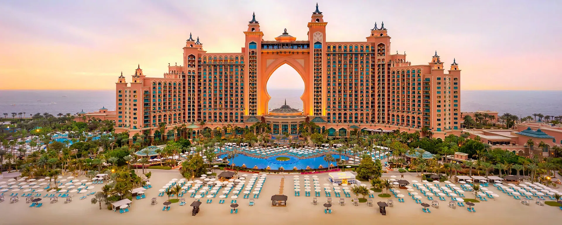 Das spektakuläre Luxushotel Atlantis The Palm in Dubai ist dank seiner einzigartigen Architektur ein Blickfang sondergleichen – wer seinen Urlaub im First-Class-Haus auf Palm Jumeirah verbringt, kommt in den Genuss zahlreicher Annehmlichkeiten: Mystische Unterwasserwelten mit atemberaubenden Aquarien, eine fantastische Umgebung beginnend bei der extravaganten Lobby, elegante Zimmer und Suiten teils mit Club-Leistungen, ein eigener Wasserpark, Restaurants und Bars in großer Auswahl, über 1000 Meter Sandstrand mit Sonnenliegen, ein Spa über zwei Etagen, Kinderclub, Pools, Sport- und Fitnessangebote, und, und, und. Komfort und Luxus auf höchstem Niveau erwarten anspruchsvolle Reisende hier. Lassen Sie sich von diesem Top-Hotel verzaubern!