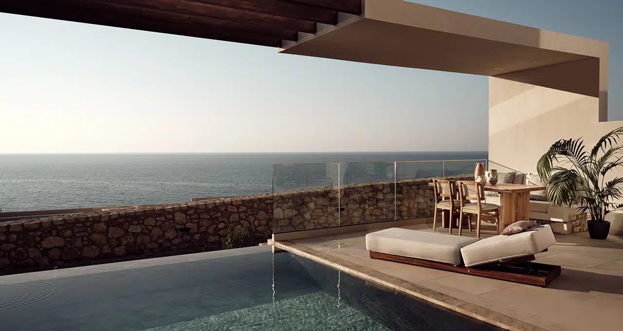 Aufgeräumtes, minimalistisches Design mit Möbeln, Textilien und Accessoires aus Holz, Naturstein, Leinen oder Bast verleihen den 178 Suiten und Villen im The Royal Senses Resort & Spa Crete, Curio Collection by Hilton einen modernen, luxuriösen und niveauvollen Anstrich. Herausragend sind die 74 Wohneinheiten mit Privatpool. Die privaten Pools der Royal Senses Villen können kostenfrei beheizt werden.