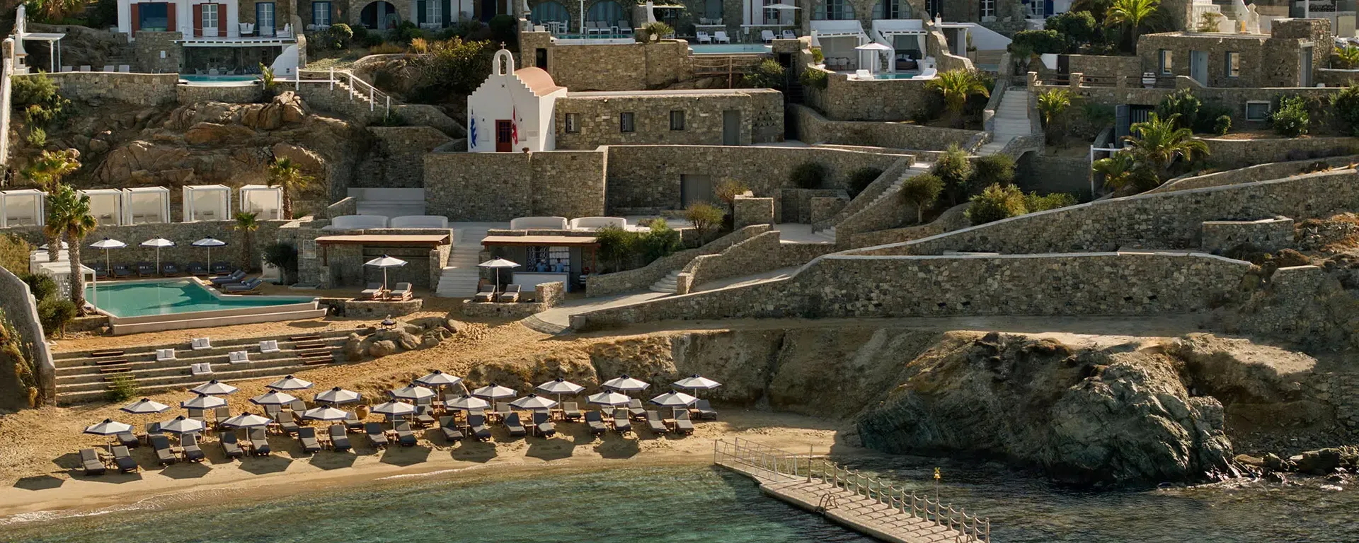 Besonders übernachten – das trifft in jedem Fall auf das Mykonos Grand Hotel & Resort zu. Das Mitglied der „Small Luxury Hotels of the World“ ist allein schon aufgrund seiner Architektur ein Hingucker auf der griechischen Insel Mykonos: Gebaut wie ein Amphitheater beeindruckt das Ambiente und die Kulisse des Luxushotels, vor allem die wunderschönen Sonnenuntergänge und fantastischen Ausblicke auf die Nachbarinsel Delos suchen seinesgleichen. Die Kombination aus kykladischer Bautradition mit weißen, kalkgetünchten Fassaden harmoniert prächtig mit dem edlen Interieur, das auf weiß-blaue Farb-Arrangements und modern-minimalistisches Design setzt. Mit dem feinen Sandstrand, dem großen Salzwasserpool und dem Athea Spa Retreat sind im Top-Resort insbesondere Paare, die Ruhe und Erholung schätzen, sehr gut aufgehoben.