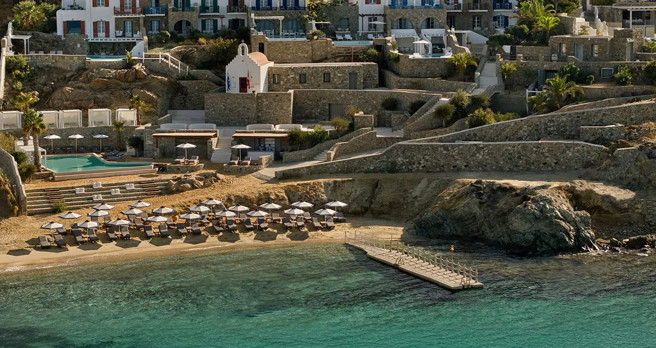 Besonders übernachten – das trifft in jedem Fall auf das Mykonos Grand Hotel & Resort zu. Das Mitglied der „Small Luxury Hotels of the World“ ist allein schon aufgrund seiner Architektur ein Hingucker auf der griechischen Insel Mykonos: Gebaut wie ein Amphitheater beeindruckt das Ambiente und die Kulisse des Luxushotels, vor allem die wunderschönen Sonnenuntergänge und fantastischen Ausblicke auf die Nachbarinsel Delos suchen seinesgleichen. Die Kombination aus kykladischer Bautradition mit weißen, kalkgetünchten Fassaden harmoniert prächtig mit dem edlen Interieur, das auf weiß-blaue Farb-Arrangements und modern-minimalistisches Design setzt. Mit dem feinen Sandstrand, dem großen Salzwasserpool und dem Athea Spa Retreat sind im Top-Resort insbesondere Paare, die Ruhe und Erholung schätzen, sehr gut aufgehoben.