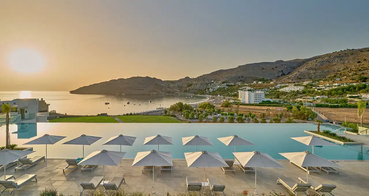 Finden Sie Ihr Sommerglück im Lindos Grand Resort & Spa! Das Erwachsenen-Hotel auf Rhodos überzeugt als entzückender Urlaubsort für Paare: Vom ästhetisch-minimalistischen Chic in Zimmern und Suiten mit Privatpools über das abwechslungsreiche Gastronomie-Konzept bis hin zu vielseitigen Sportmöglichkeiten, im Adults Only-Hotel steht einem unbeschwerten und atmosphärischen Urlaub nichts im Weg. Vor Ort umsorgt Sie der maßgeschneiderte Fünf-Sterne-Service, während Sie vom leicht erhöht liegenden Infinitypool auf die herrliche Meeresbucht Vlicha blicken. Die imposante Kulisse ist nicht nur ein perfektes Fotomotiv, sie bildet auch den idealen Rahmen für entspannte Urlaubstage am Strand und spannende Entdeckungstouren auf der Sonneninsel.