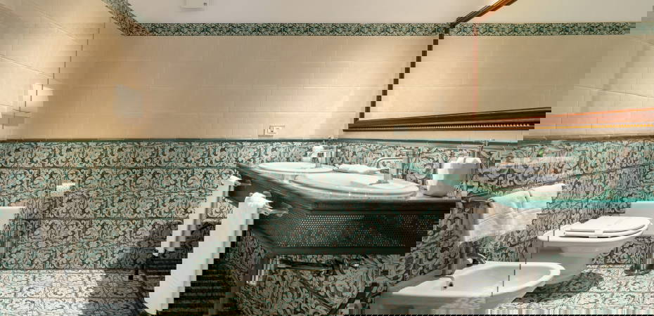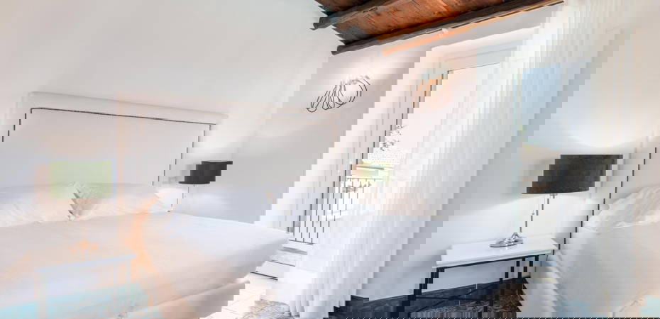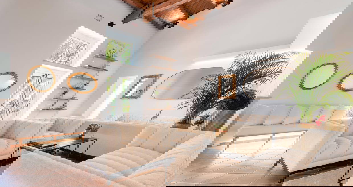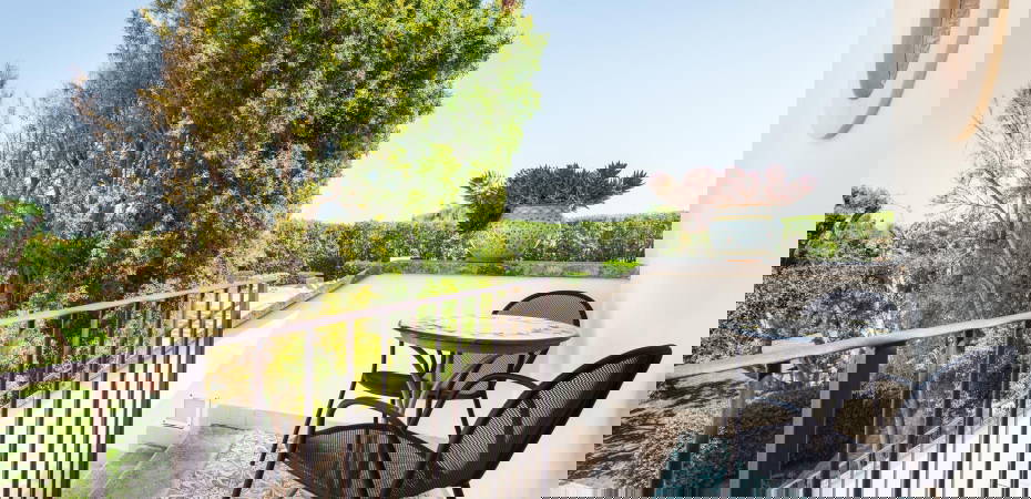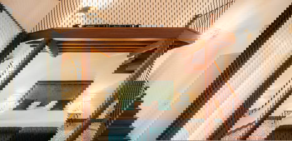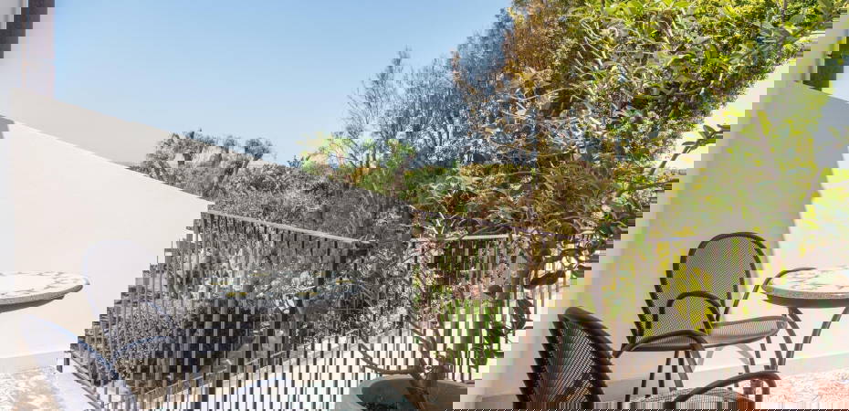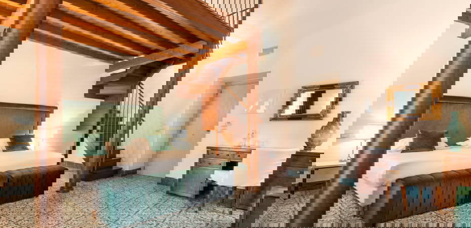 Die Suiten befindet sich im ersten Stock des historischen Gebäudes und verfügt über eine große private Terrasse mit exklusivem Blick auf den Botanischen Garten. Details wie die freiliegenden Holzbalken und handbemalten Keramikfliesen schaffen ein gemütliches Ambiente. Die hölzerne Galerie inklusive Sofa läd zum Entspannen ein.