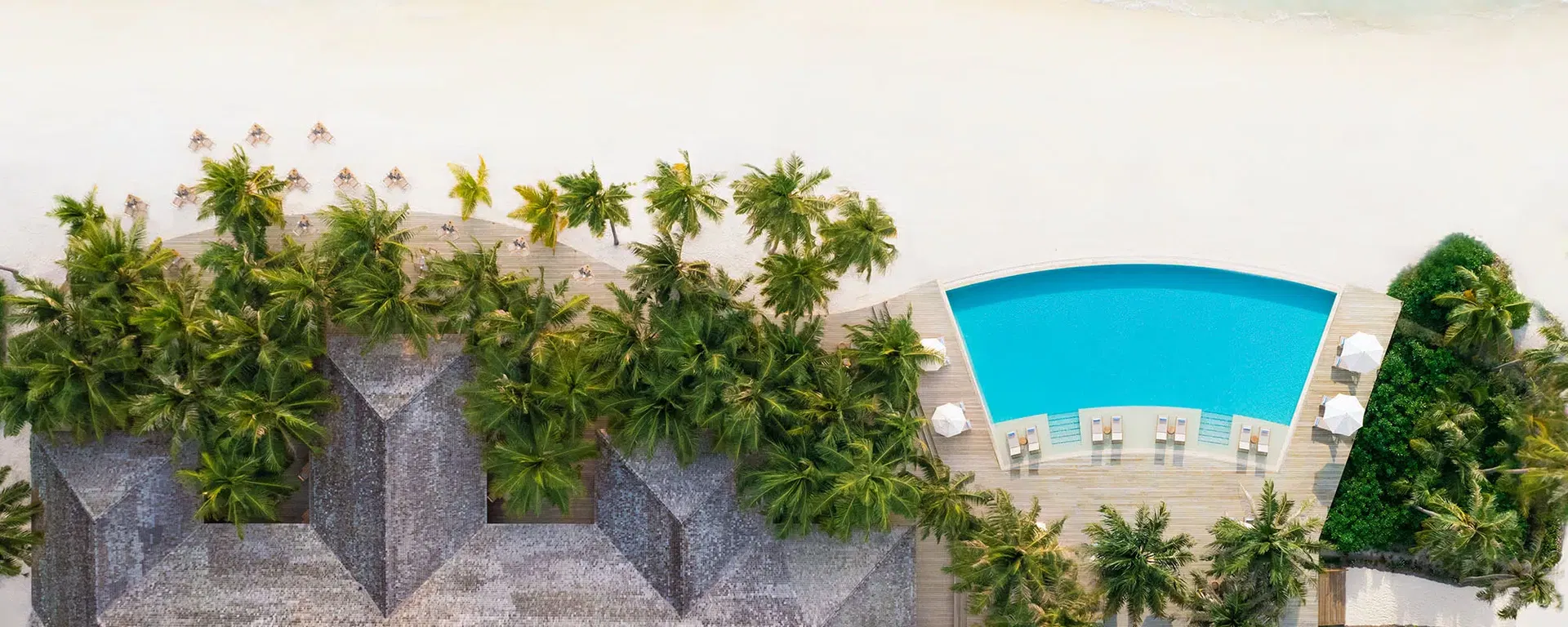 Die Dheru Beach Pool Villen liegen auf der kleineren Insel Dheru inmitten der grünen Inselvegetation nur wenige Schritte vom Strand entfernt. Die Villen verfügen über ein Außenbadezimmer mit Dusche sowie eine schattige Terrasse und privatem Pool.