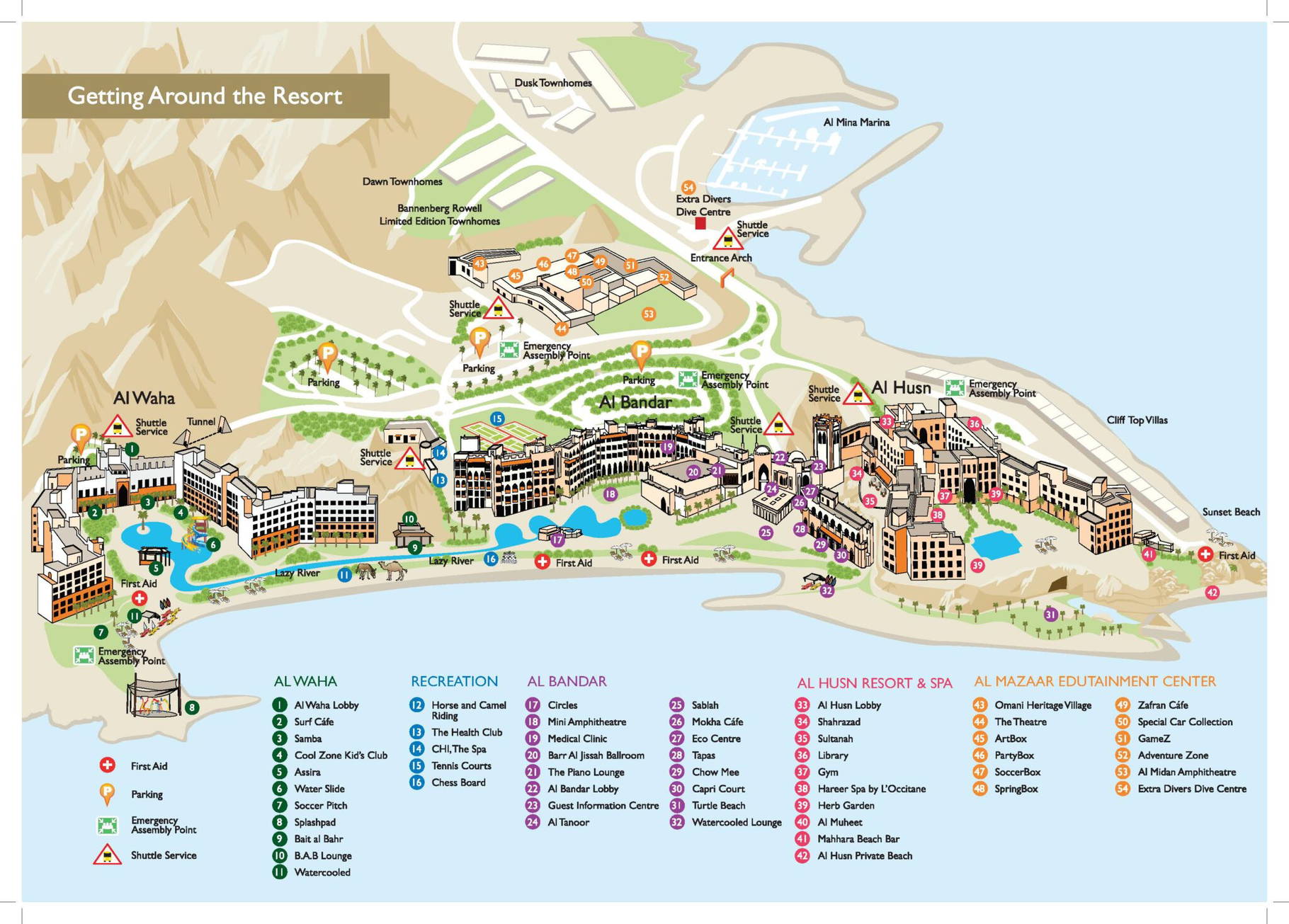 Das Al Husn Hotel Muscat ist etwa 30 Minuten Autofahrt von Muscat entfernt. Das Schwesterhotel Shangri-La Barr Al Jissah, Muscat befindet sich direkt neben der Anlage. Bis zur Altstadt sind es 15 Minuten Fahrtzeit und der 48 Kilometer entfernten Flughafen von Muscat wird in ca. 50 Minuten erreicht.