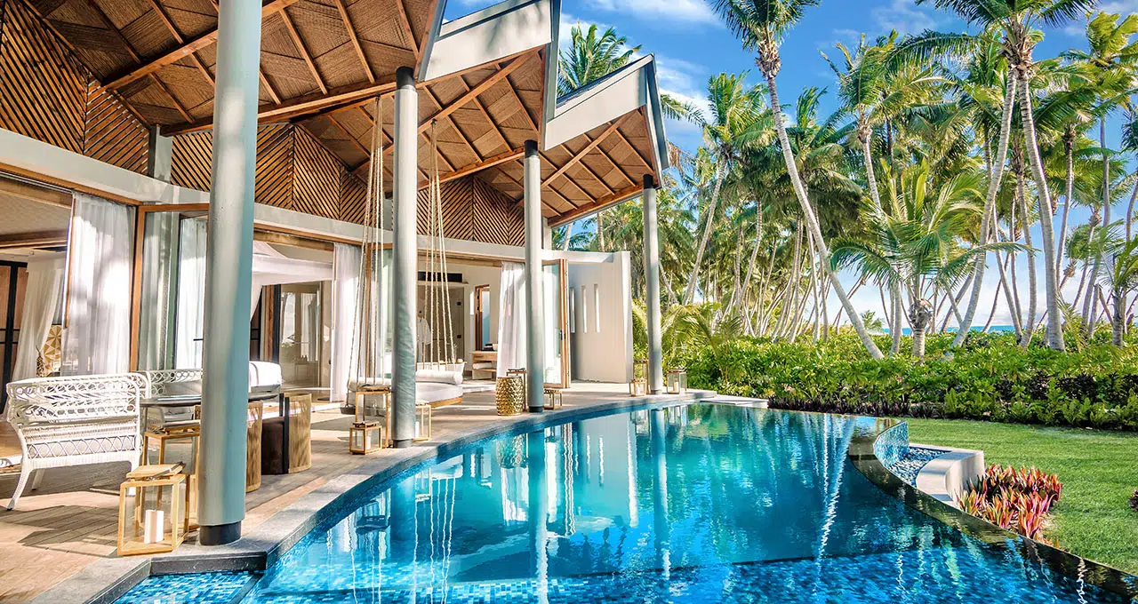 Die Blacktip Villa überzeugt mit einem durchdachten und weitläufigen Design und direkten Zugang zum Strand. Sie verfügt über zwei Schlafzimmer, eines mit einem Kingsize-Bett und eines mit zwei Doppelbetten und jeweils einem en suite Badezimmer mit freistehender Badewanne, zwei Waschtischen und Regendusche. Zudem verfügt der Innenraum über ein separates Wohnzimmer. Von allen Zimmern gelangt man auf die großzügige Außenterrasse mit privatem Pool, zwei Außenduschen und Essbereich im Freien.