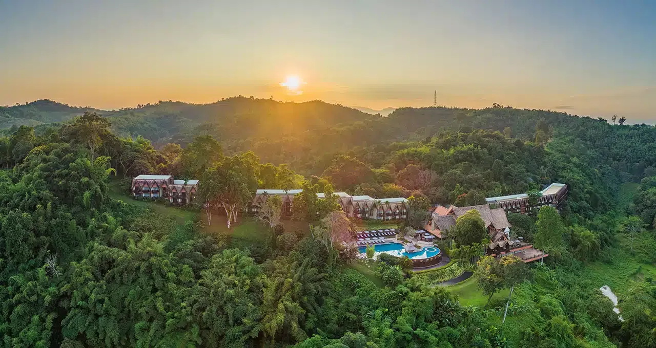 Das Anantara Golden Triangle Elephant Camp & Resort liegt im Herzen des Goldenen Dreiecks auf einem Gebirgskamm. Im Norden Thailands treffen hier zwei Flüsse und drei Länder (Thailand, Myanmar und Laos) aufeinander. Der Flughafen Chiang Rai ist etwa 60 Kilometer entfernt, der Transfer benötigt etwa eine Stunde.